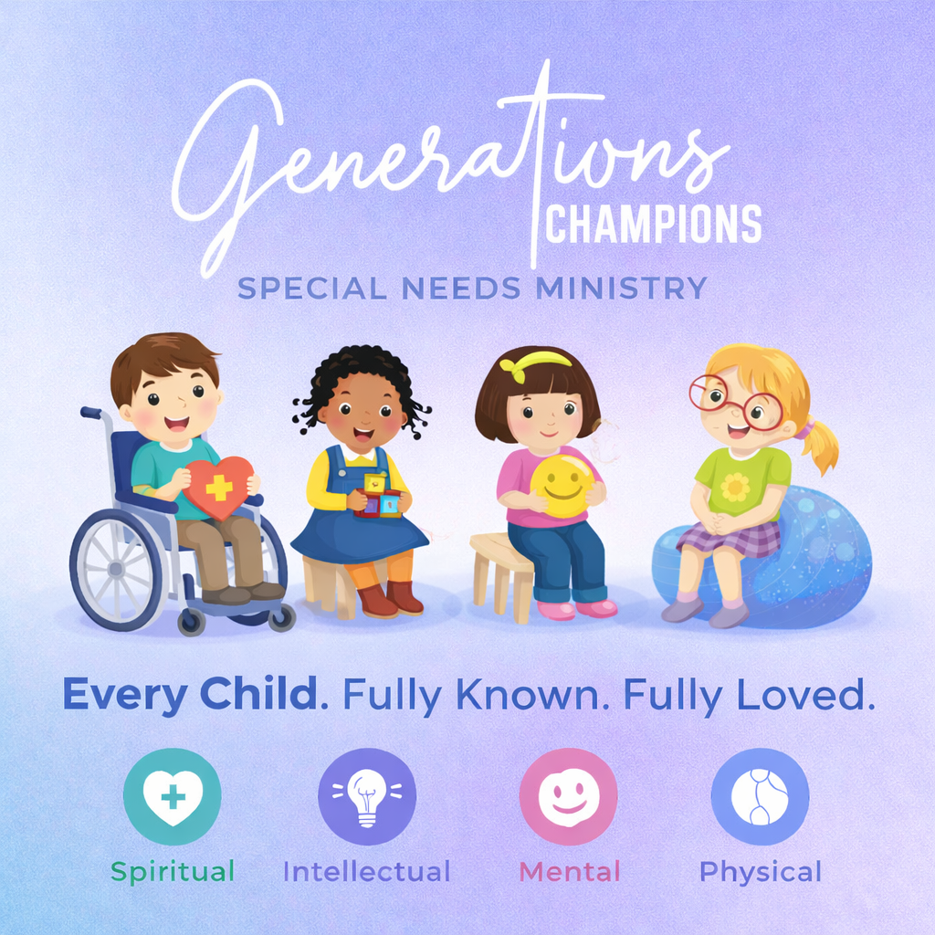 Generations Champions is a specifically designed area for kids with special needs. Our goal was to develop a program that would meet the needs of children in four important ways: spiritually, intellectually, mentally, and physically.